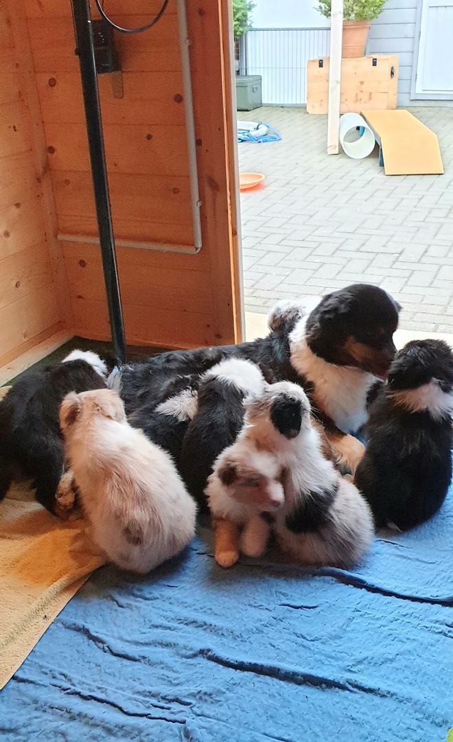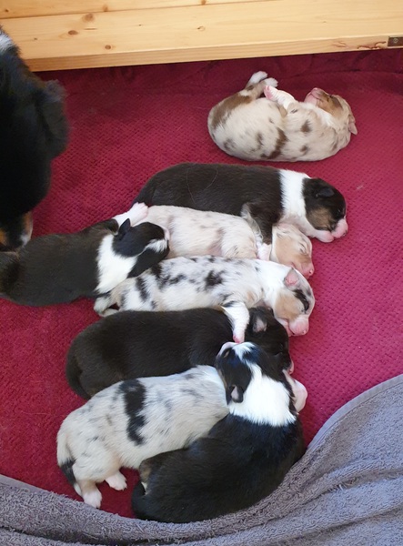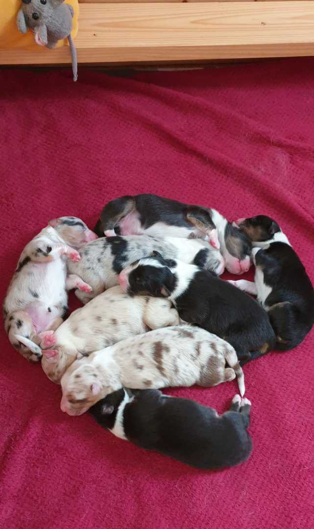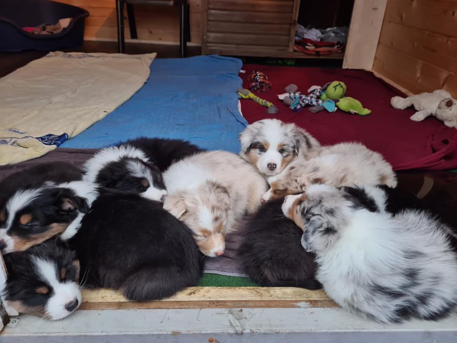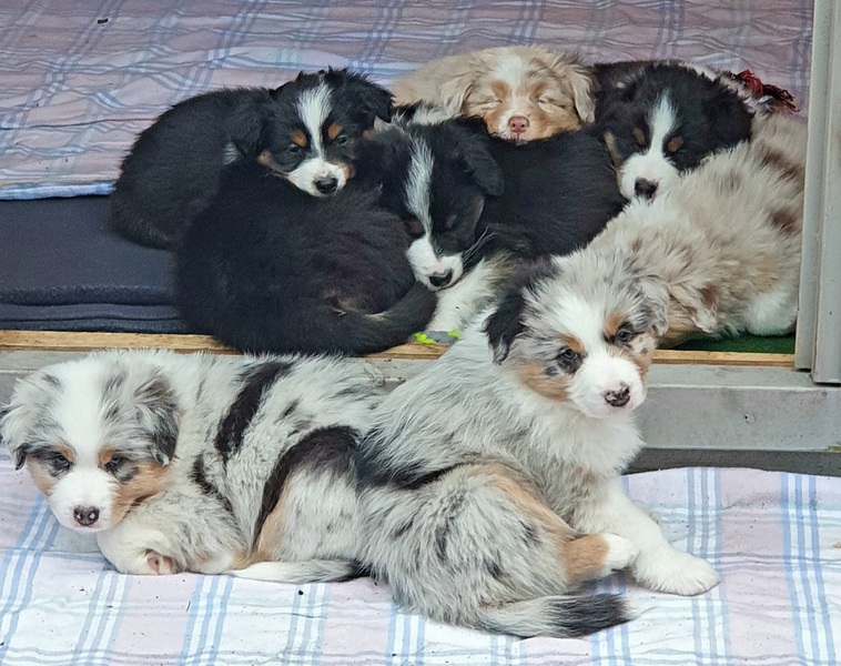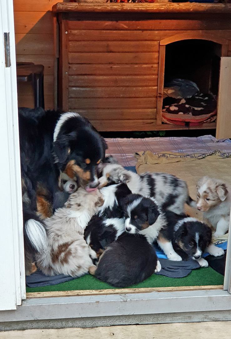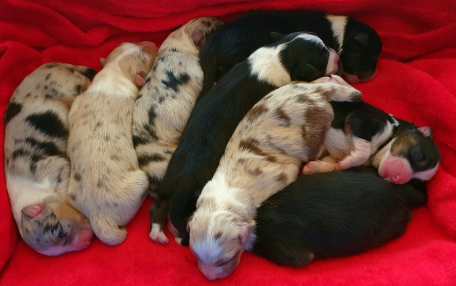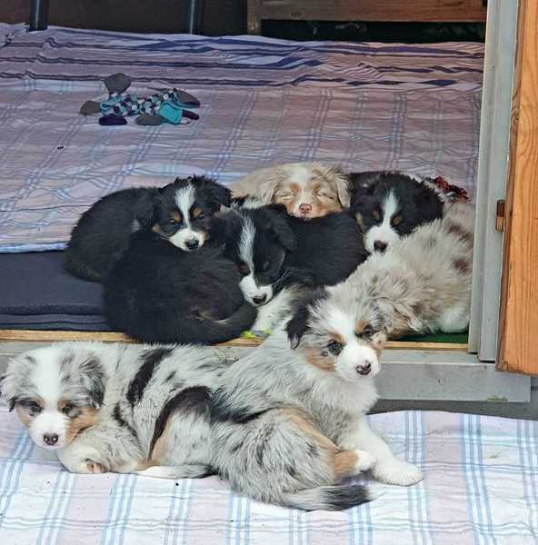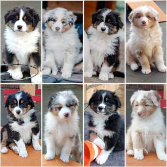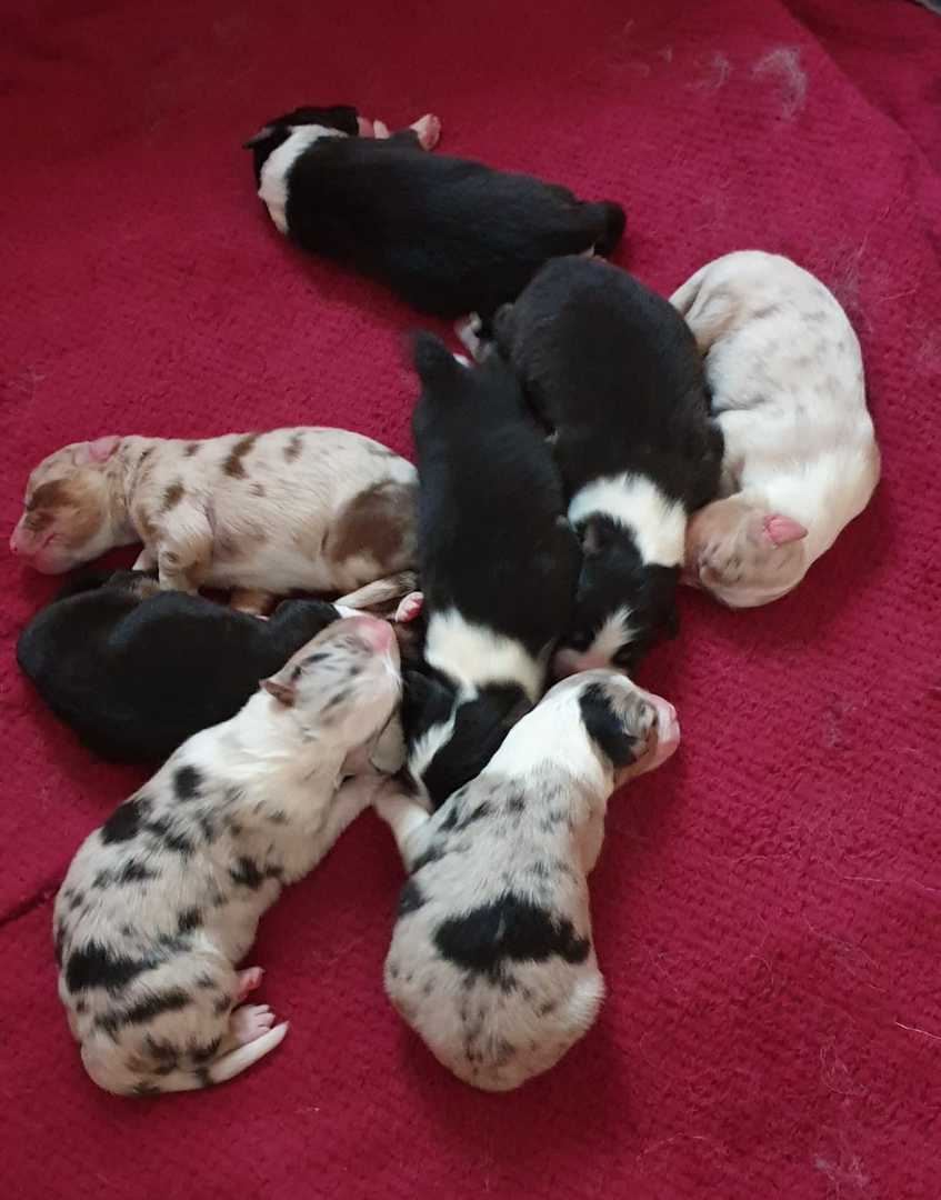Es sind 4 Black Tri, 2 Blue Merle und 2 Red Merle Welpen.