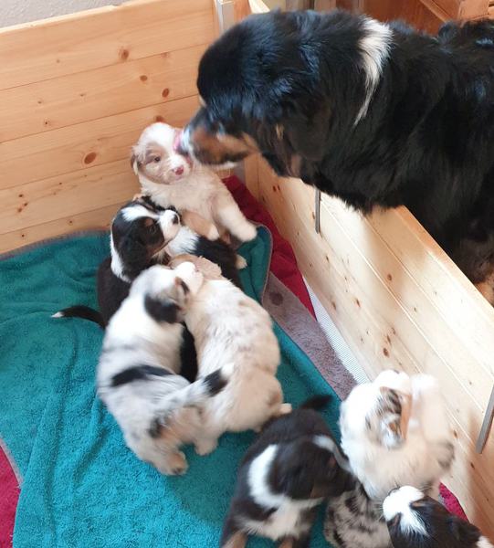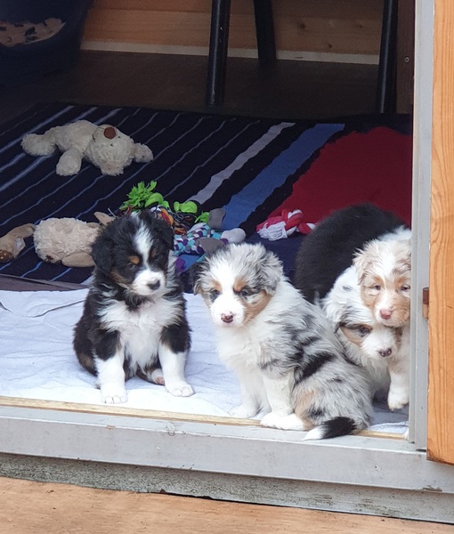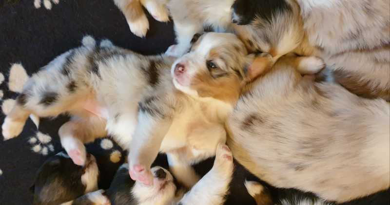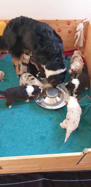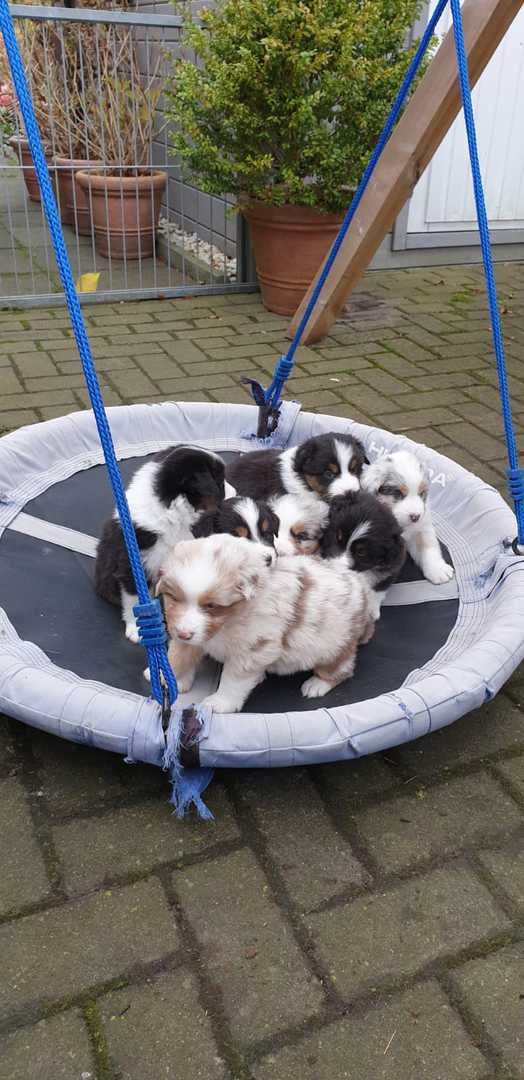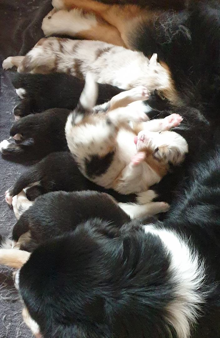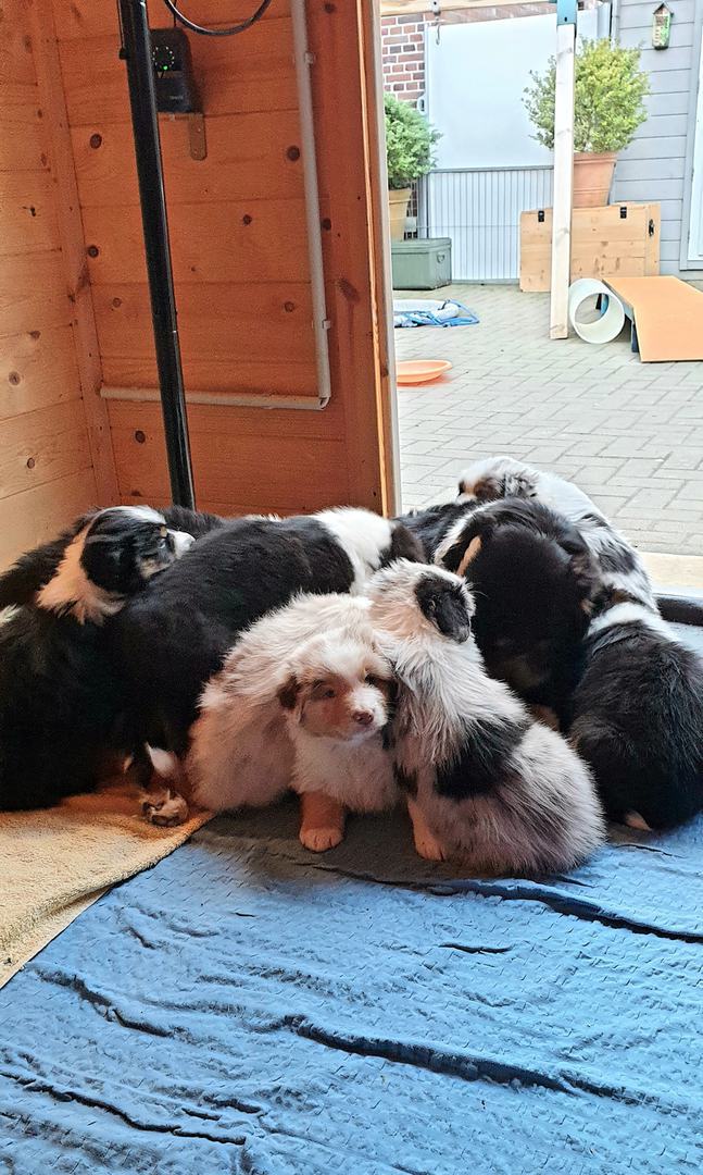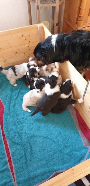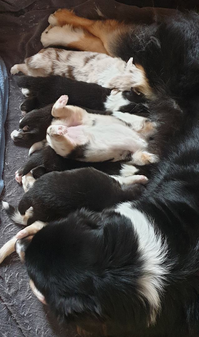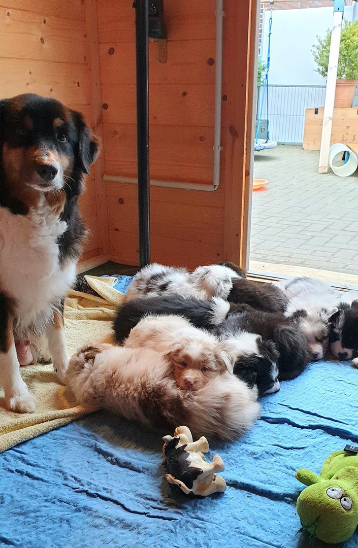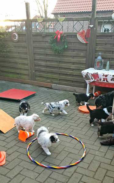 Es sind 4 Black Tri, 2 Blue Merle und 2 Red Merle Welpen.
