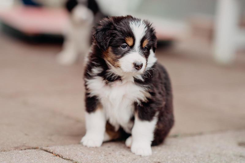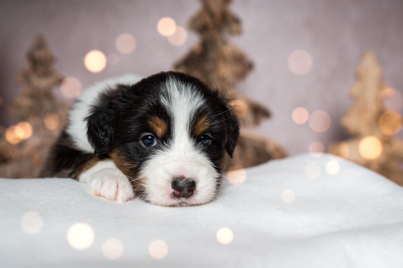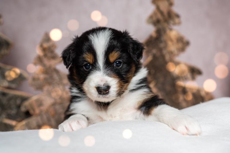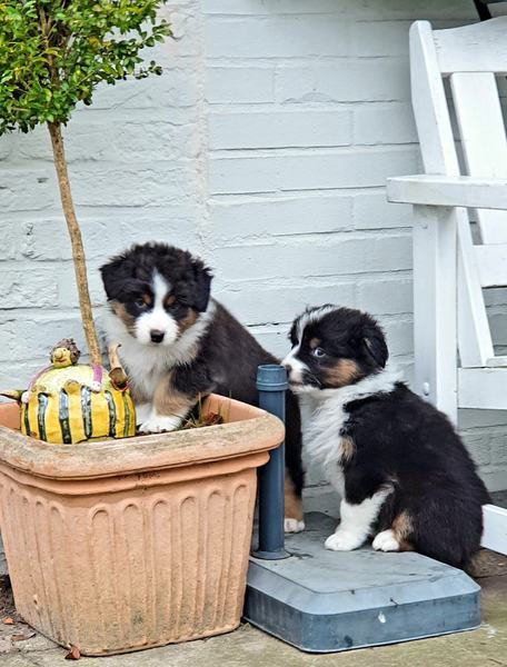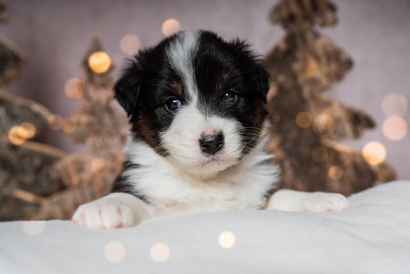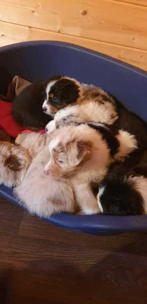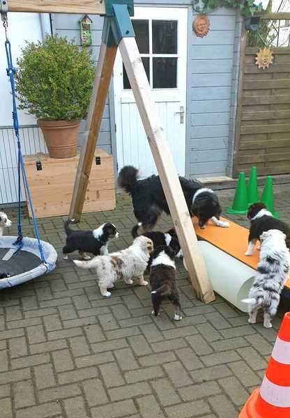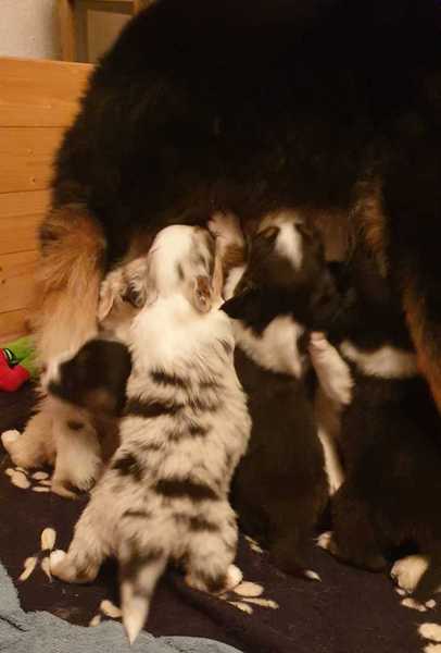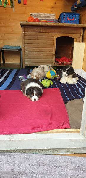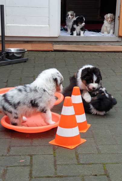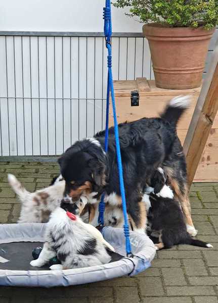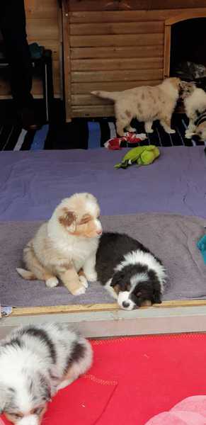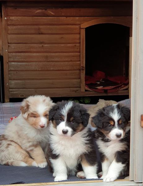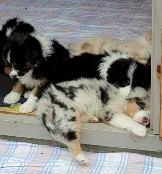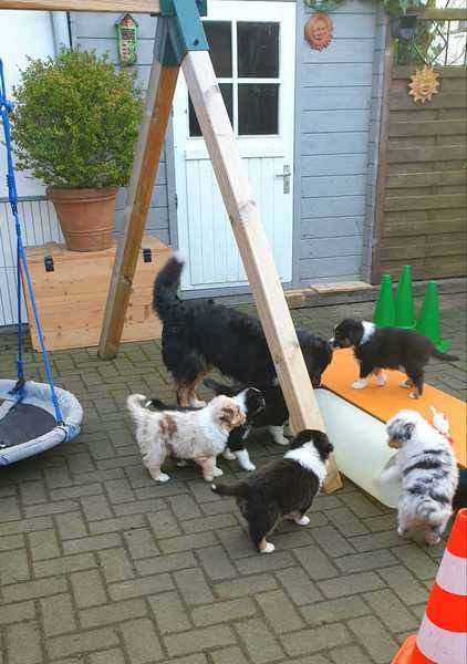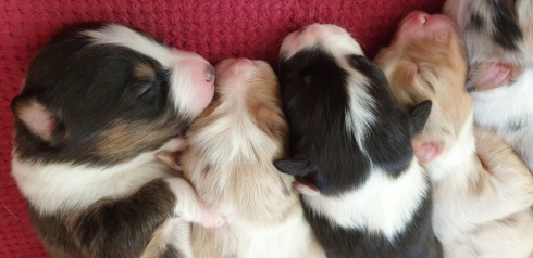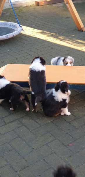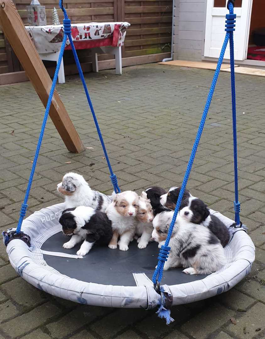 Es sind 4 Black Tri, 2 Blue Merle und 2 Red Merle Welpen.