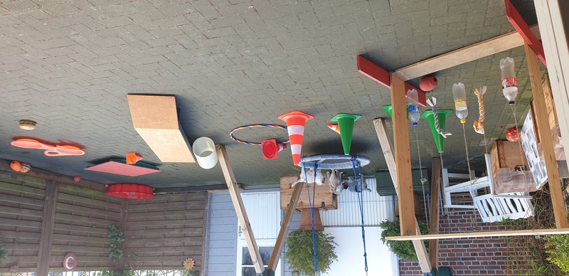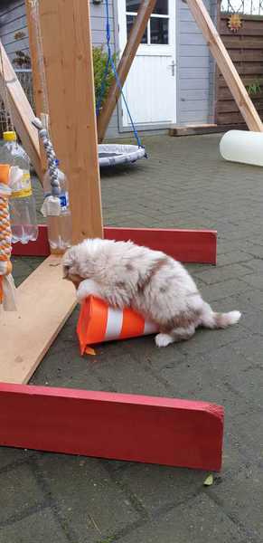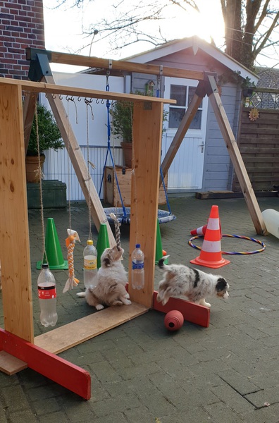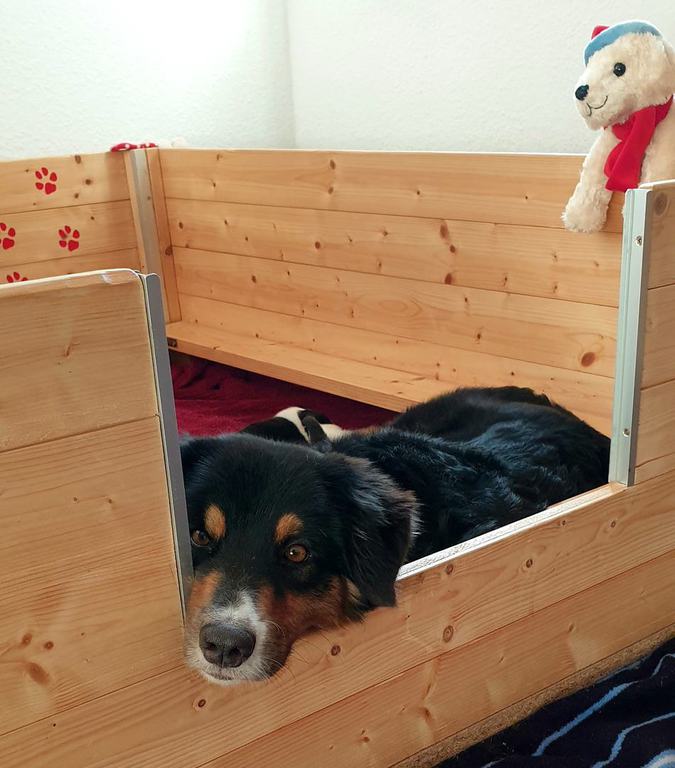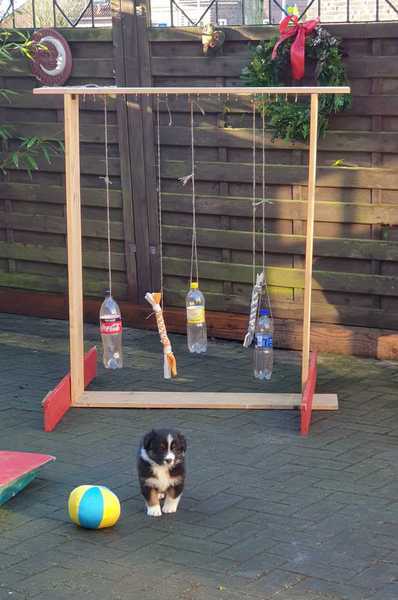 Heute eine Stunde draußen, Mittagsschlaf in der Hundehütte und das erstemal in die Hundeschaukel.
